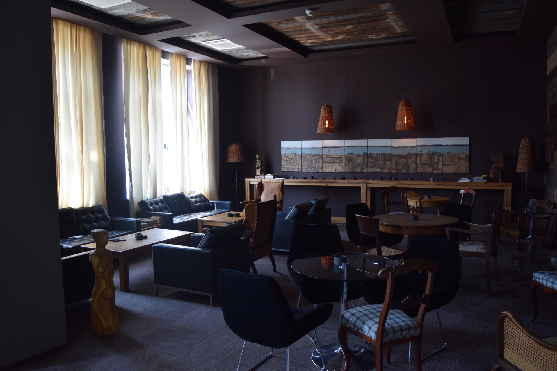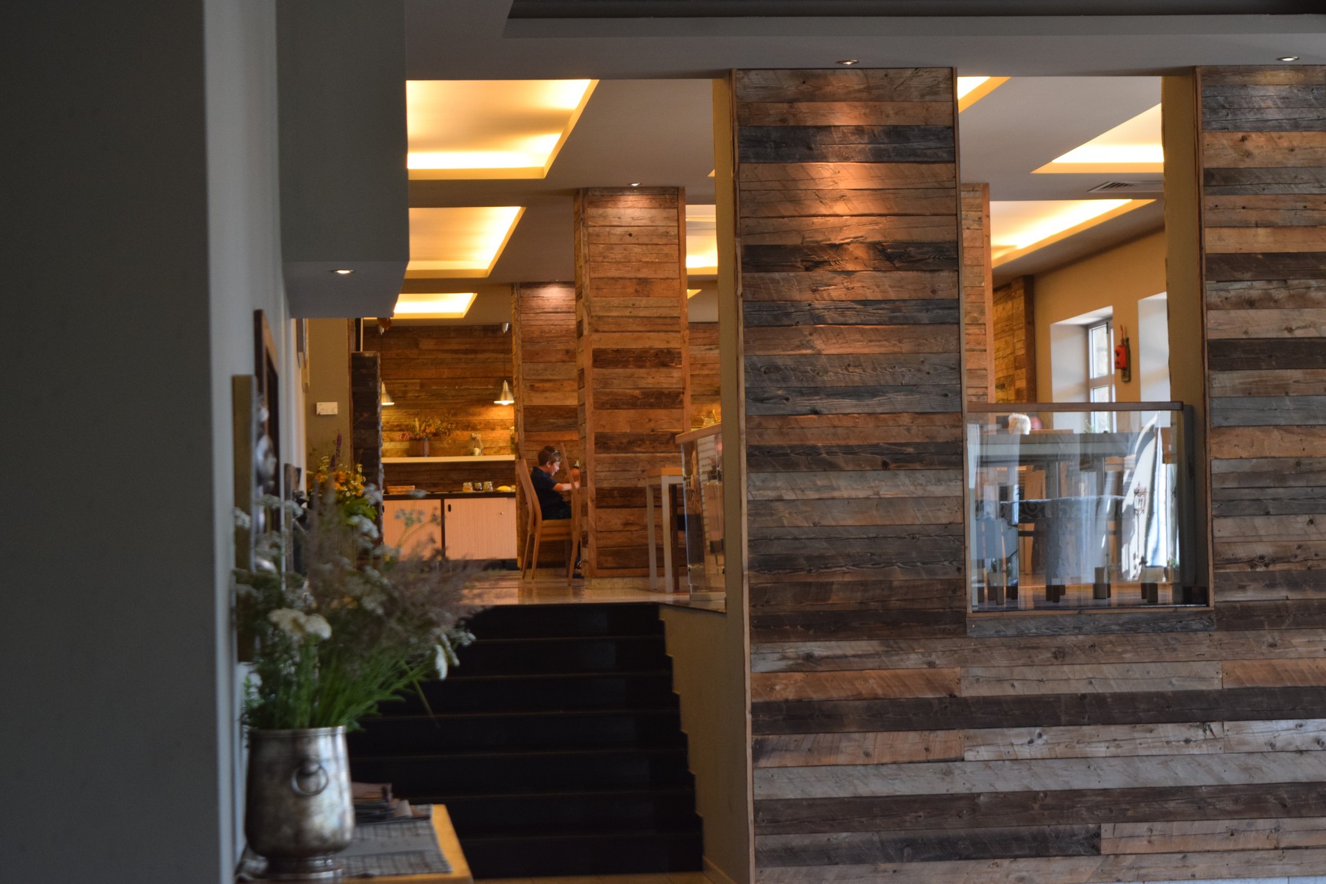 Au rez-de-chaussée, vous serez impressionnés en premier lieu par la grandeur et la hauteur des salles. Secondement, par la multitude de petites choses qui décorent ces salles ; objets de bois traditionnels, peintures et fresques. Et enfin, par le bar qui fait joli étalage d’une grande diversité d’alcool. La salle pour le petit-déjeuner se trouve au fond à droite en rentrant. C’est un buffet diversifié et complet.