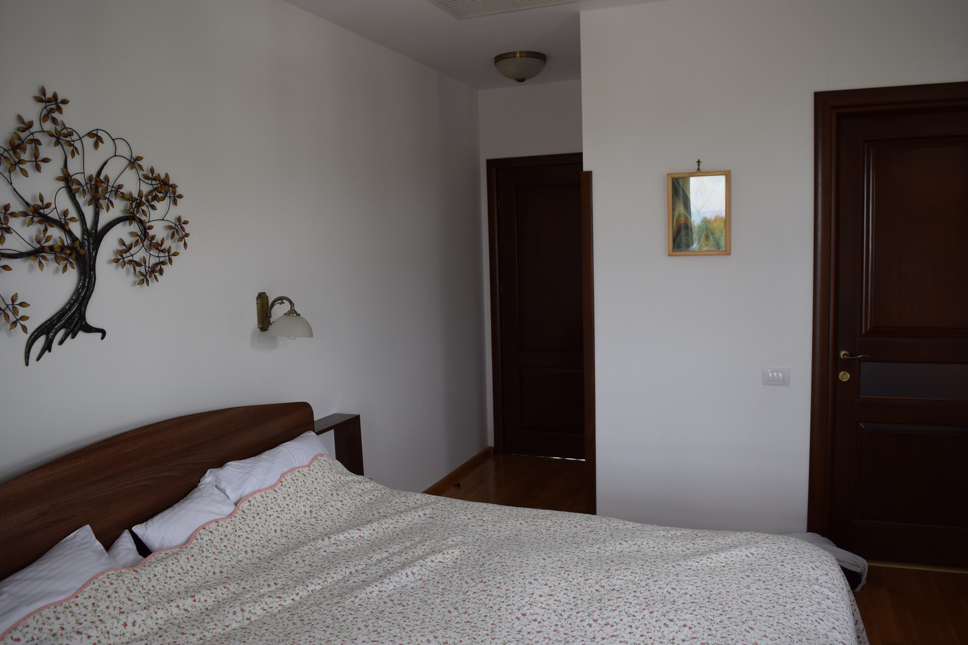 Bien éclairée, la chambre offre une décoration simple et belle, meublée en bois sombre. Les couleurs dominantes sont blanches, marrons et roses, un vrai nid romantique.