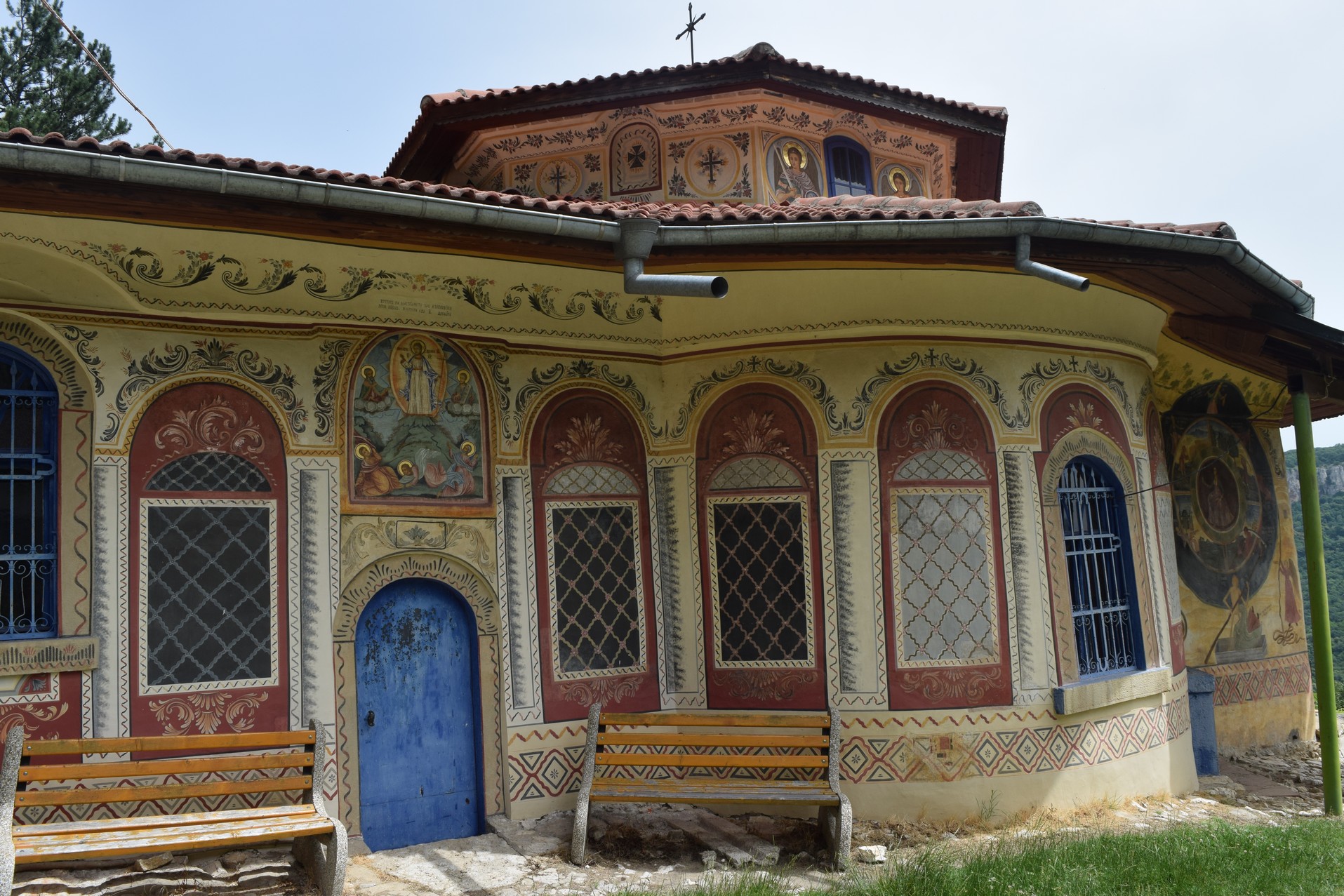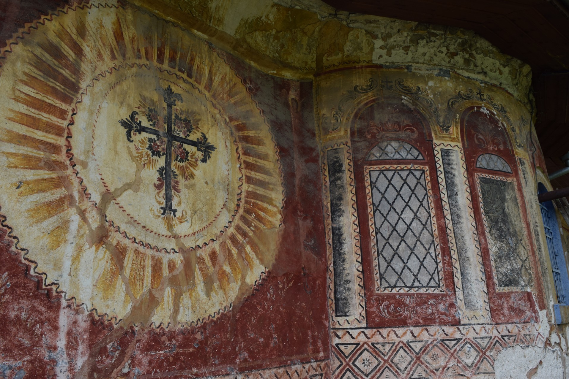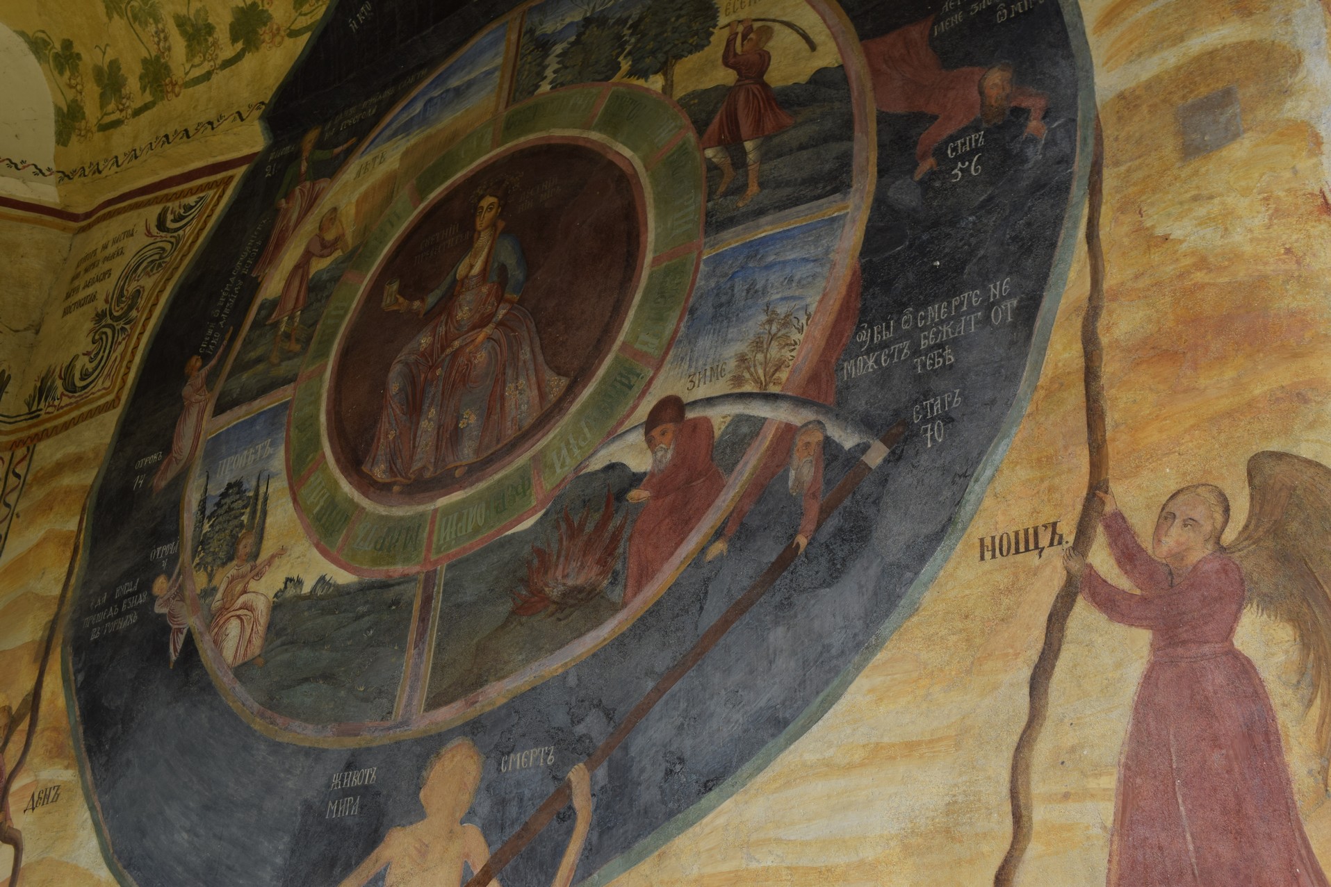 Non, moi, j’ai passé mon temps à déguster l’église. Celle-ci sort totalement de l’ordinaire avec ses multiples fresques externes. Ici, on peut apprécier une représentation de la roue de la vie, mais il y a beaucoup plus, pénétrez l’église, faites-en le tour…