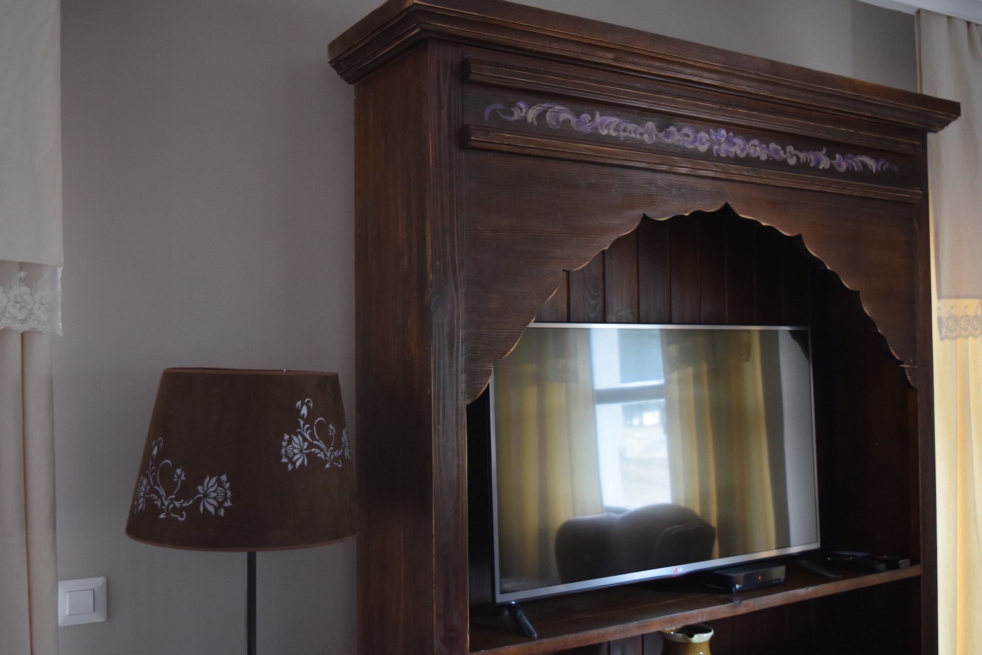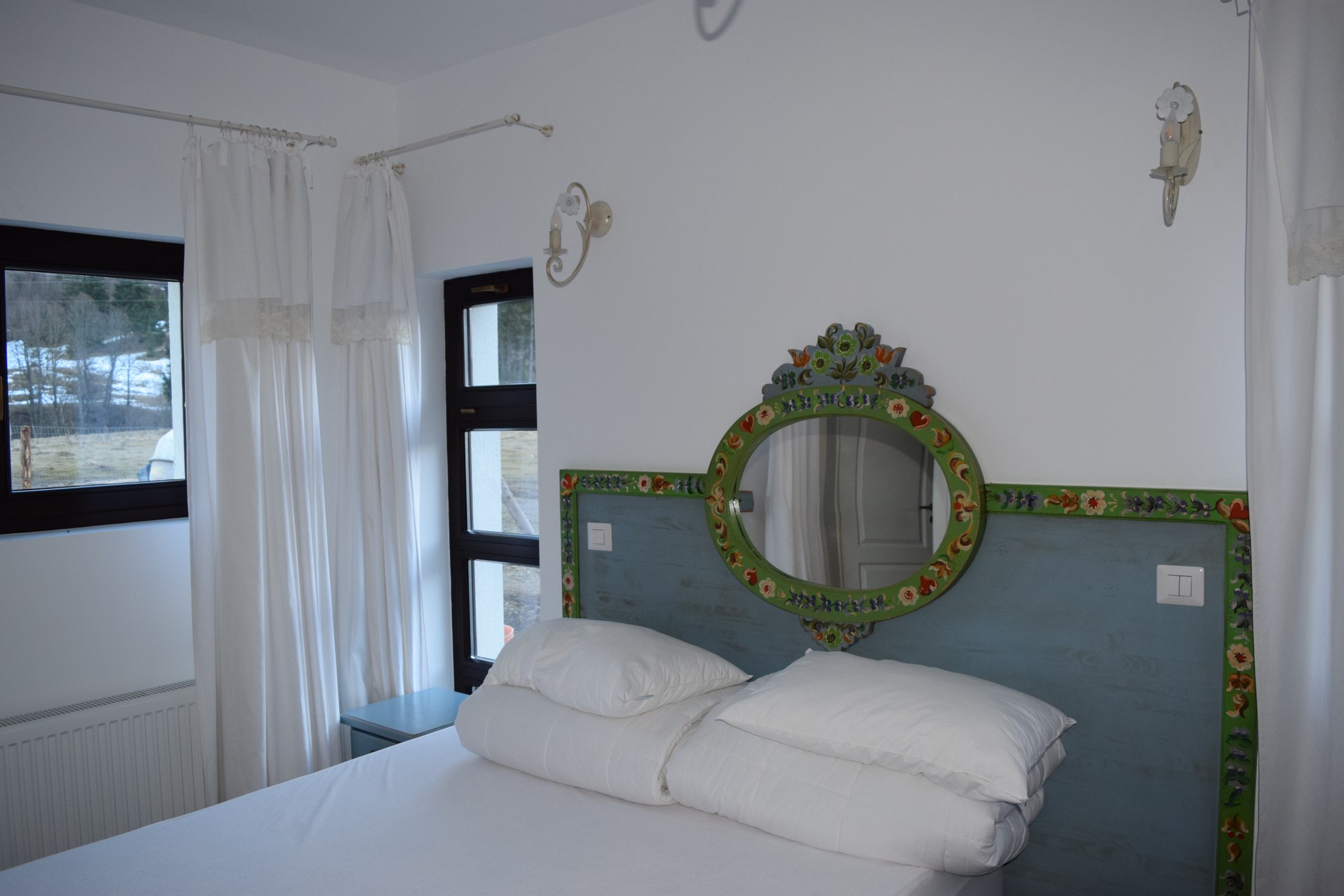 Arrivé !! Pastel Chalet se trouve sur la gauche. S’il vous vient l’idée de continuer sur la route, sachez que vous pourrez rejoindre Brasov après de nombreux efforts, sinon, avec encore plus d’effort et sans voiture, vous pourrez viser les sommets enneigés. Mais concentrons-nous sur Pastel Chalet. Celui-ci se trouve en fond de vallon, cerclé de collines plus ou moins hautes, la plus haute se trouvant face à notre fenêtre. Côté sud, elle cache une partie du mont Ciucas. Ce fond de vallon est essentiellement constitué de pâtures, terres destinées au repas de nos amis les moutons, je dois avouer ne pas en avoir croisé là-bas, mais il se peut que vous en ayez le plaisir :).