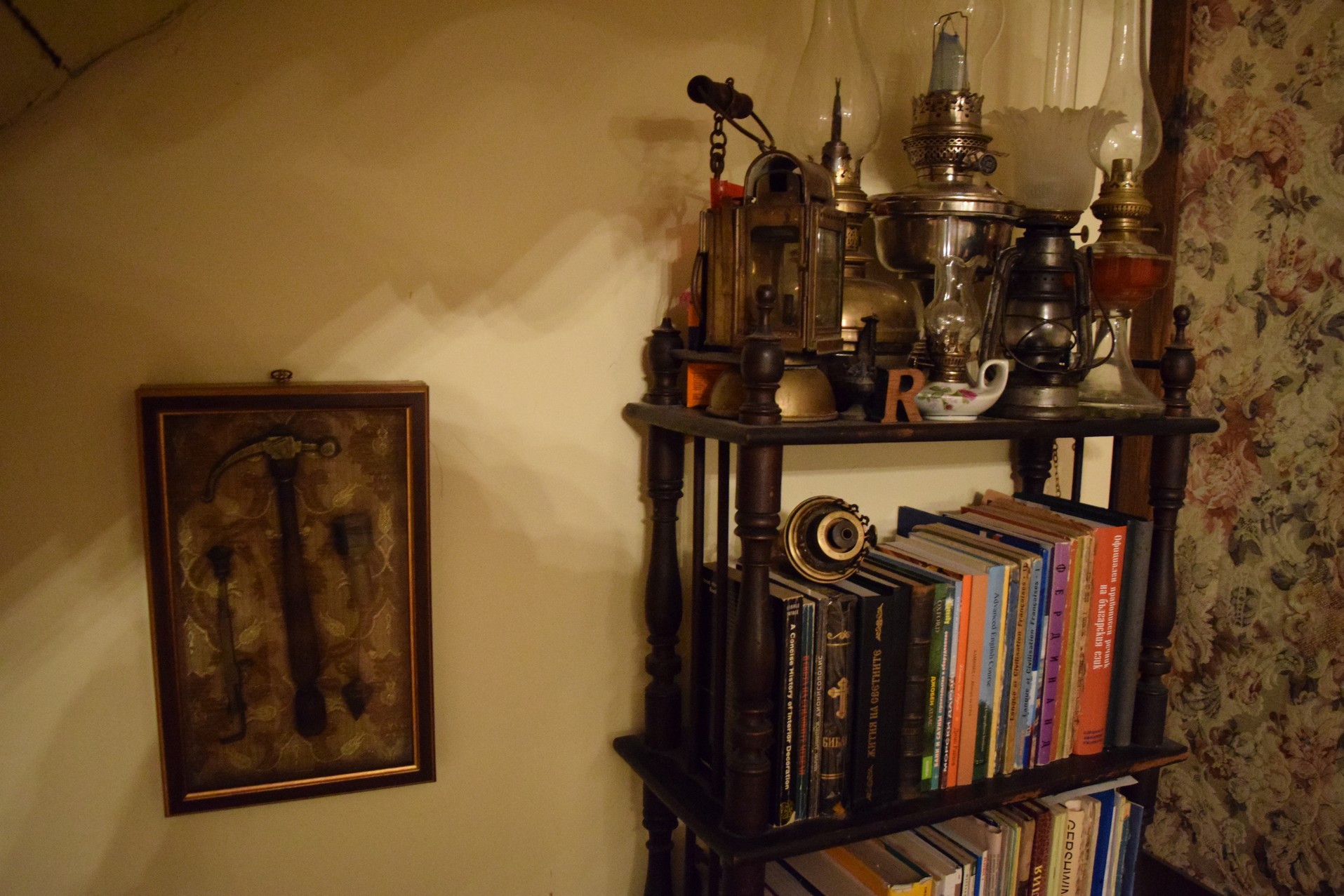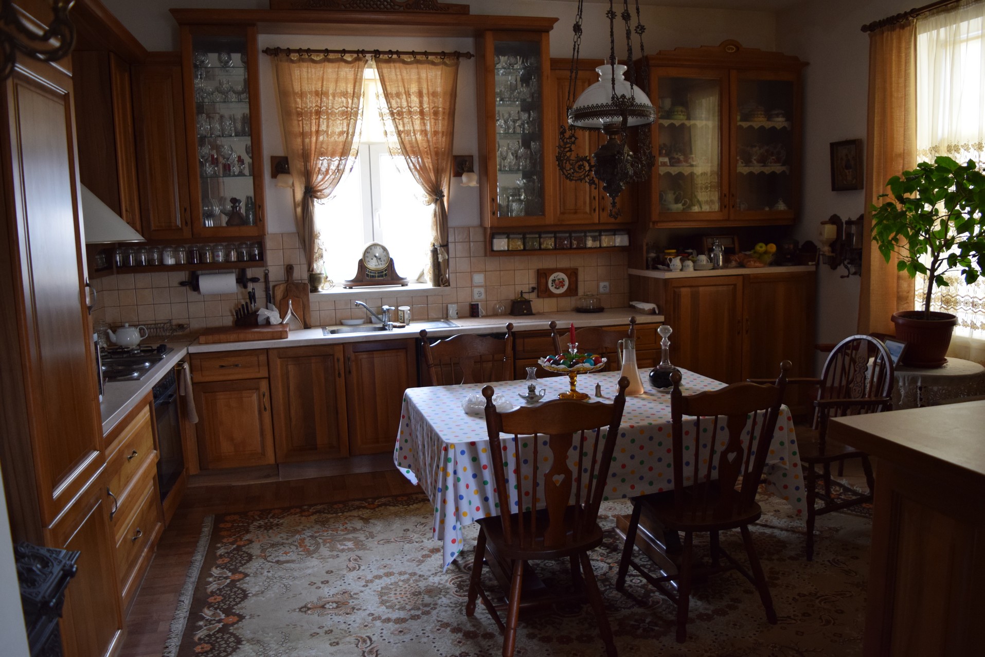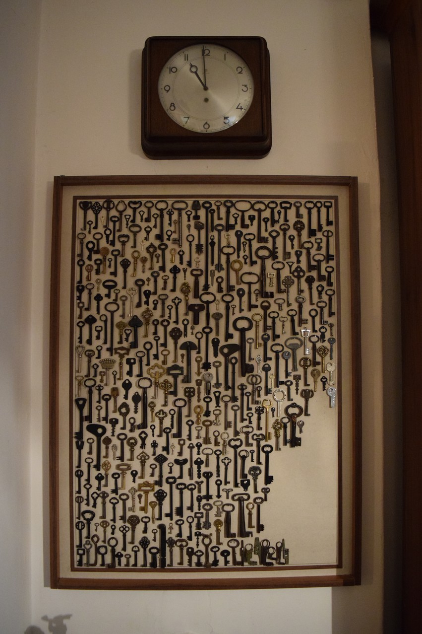 La cuisine, elle aussi très spacieuse, est, tout autant que le salon, une vraie caverne d’Ali baba. On retrouve de vieilles horloges, une radio venant de je ne sais où qui peut capter les ondes de Paris et autres villes, des moulins à café et j’en passe. Une très belle collection de clés fait étalage des maintes et belles portes que les propriétaires ont pu ouvrir au court de leur vie.