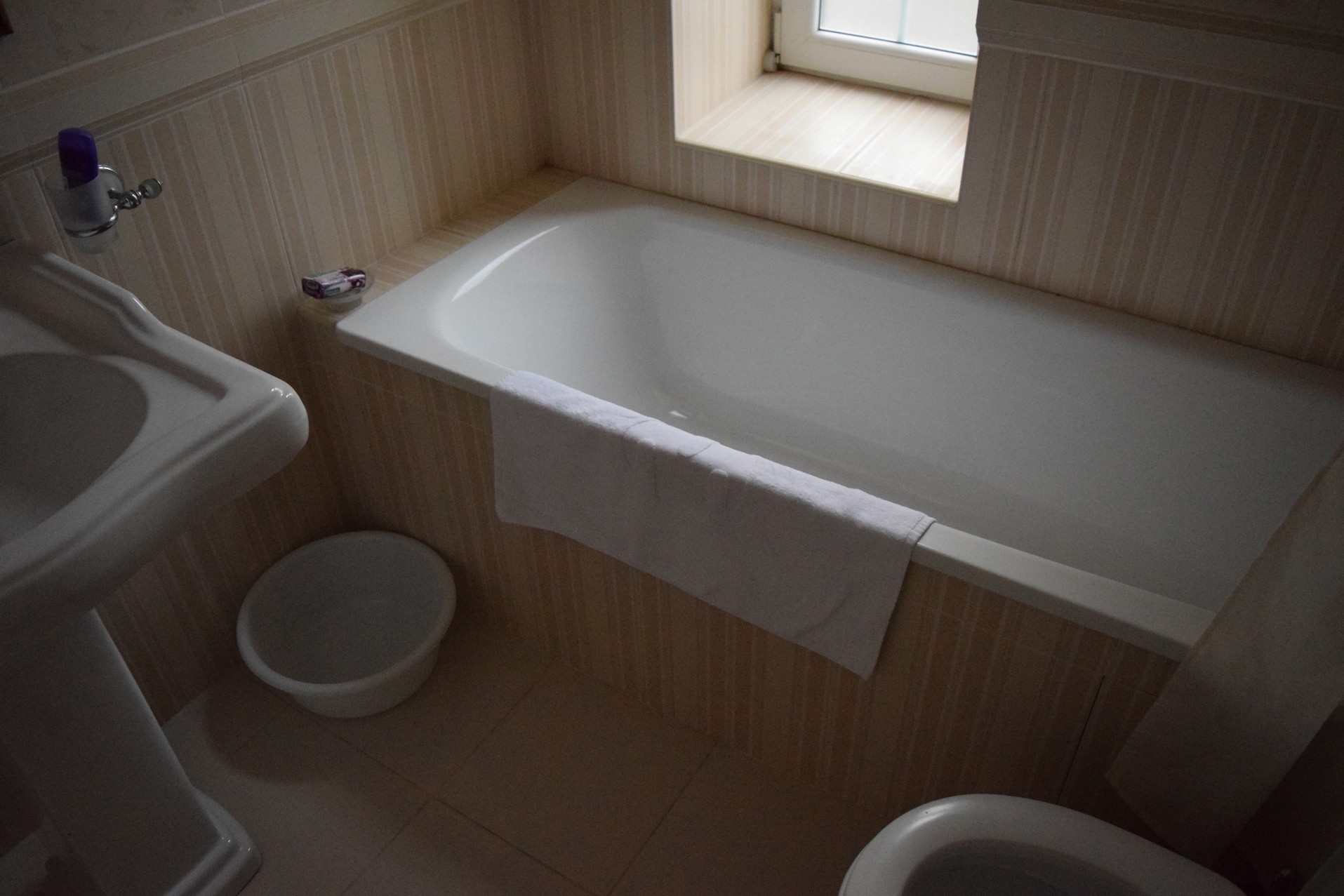 Pour finir, ma chambre, très vaste et spacieuse. Le mobilier est toujours aussi beau ; un lit à baldaquin, de vieilles tringles à rideaux en bois (que je dois insulter d’un nom bien trop jeune pour les qualifier), un poêle à bois en céramique… Je vous laisse admirer les belles photos. La salle de bain se rejoint quant à elle par une porte donnant dans le vestibule, ce qui malgré qu’elle soit isolée, offre de l’intimité, et les hôtes ne l’utilisent pas.
